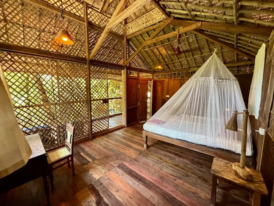 Inside, you’ll find a comfortable bed with a mosquito net and a private bathroom. We don’t use air conditioning; the shade of the trees keeps the cabanas naturally cool.